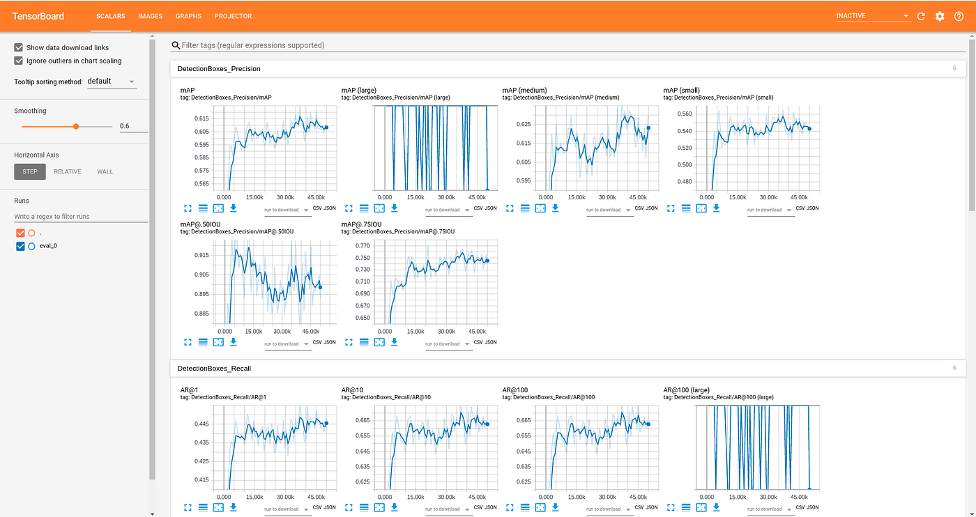 Ce Tensorboard permet de nous afficher les courbes et les mesures des différents paramètres permettant ainsi de définir le degré de précision du modèle utilisé pour l'apprentissage.